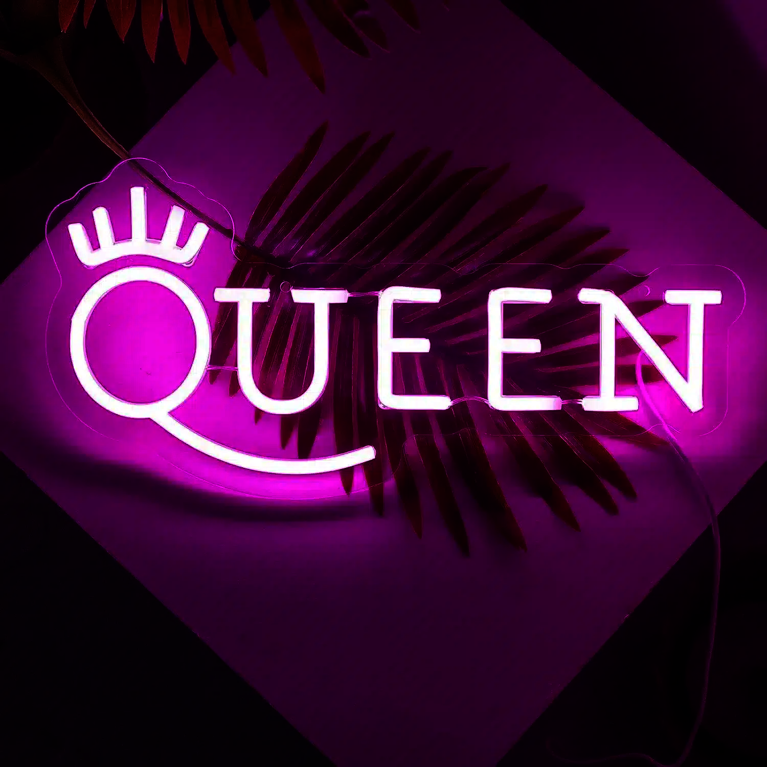 Le Néon Queen affiche le mot “QUEEN” en lettres majuscules lumineuses, avec une petite couronne stylisée au-dessus du “Q”.