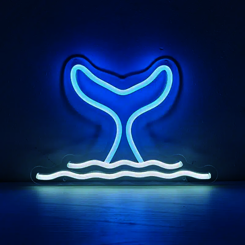 Le Néon Queue Baleine représente la partie inférieure d’une baleine émergeant de l’eau.
