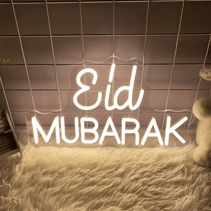 Ce néon est soigneusement conçu pour reproduire l’élégante calligraphie arabe des mots “Eid Mubarak”, une expression traditionnelle qui se traduit par « qu’il soit bon pour vous » ou « que Dieu vous le bénisse ».