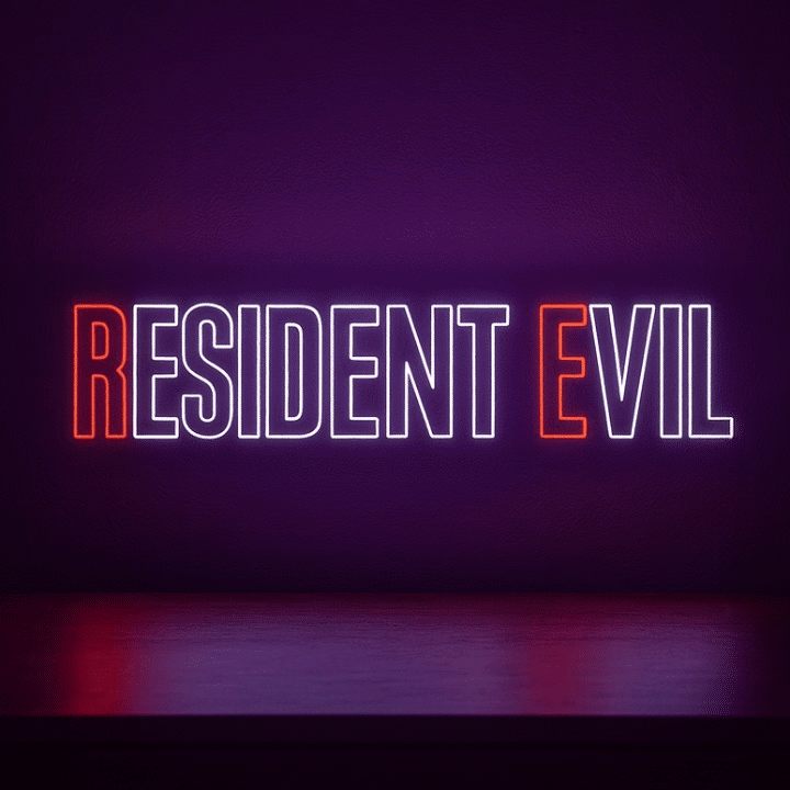 Ce néon reproduit fidèlement le lettrage caractéristique de la série, avec “RESIDENT EVIL” écrit en lettres capitales où les lettres R et E se distinguent par leur couleur rouge vif contrastant avec le blanc du reste du texte.