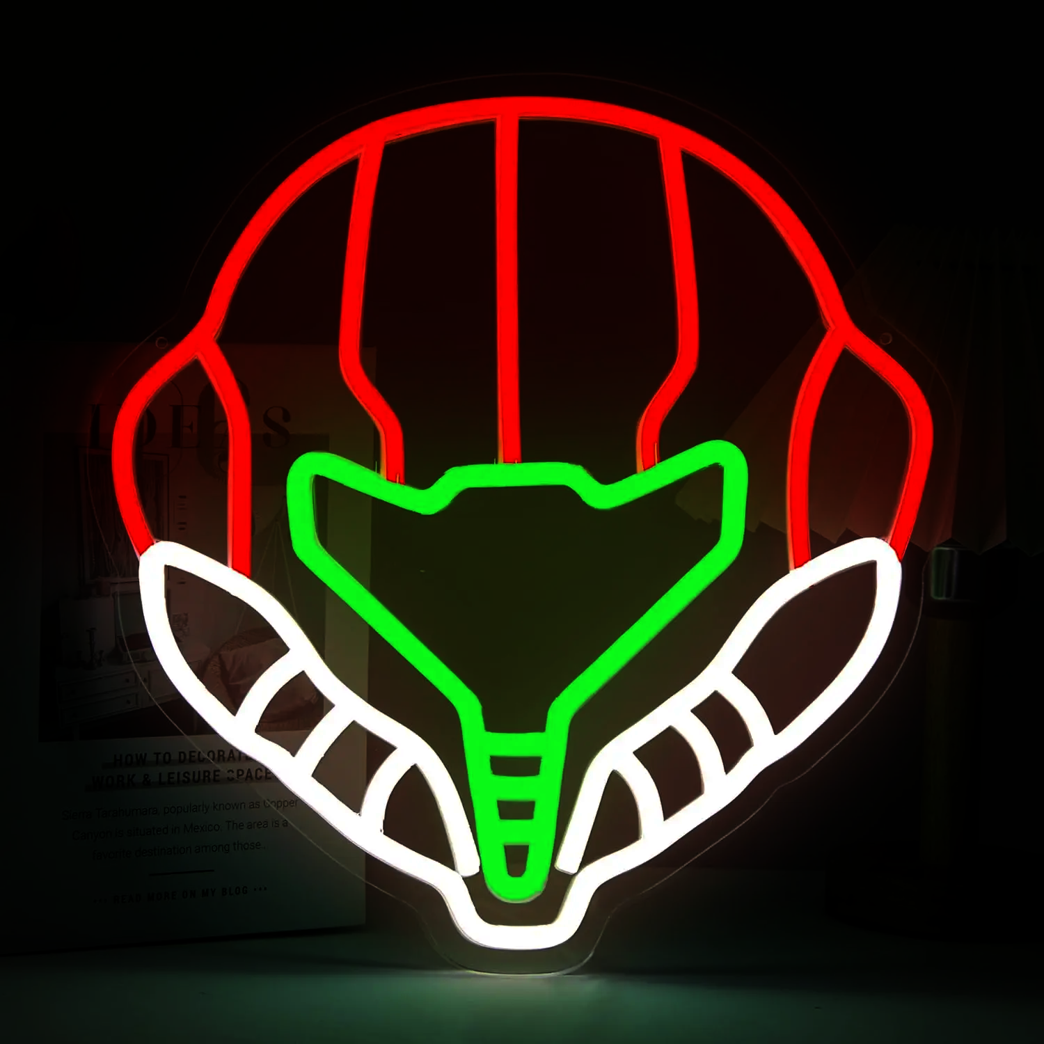 Le Néon Samus Metroid Prime représente l’emblématique casque du personnage principal de la série de jeux vidéo Metroid.