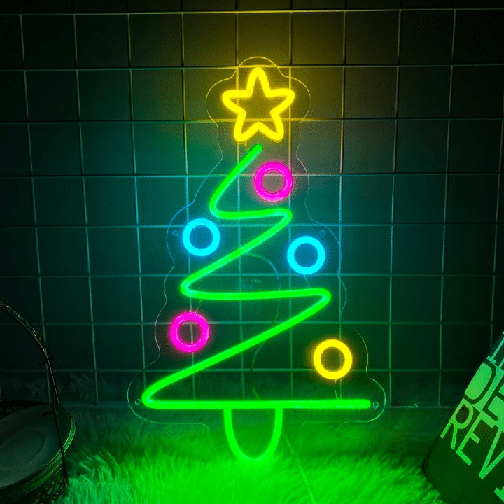Le Néon Sapin de Noël représente un arbre de Noël stylisé aux couleurs vives et éclatantes.