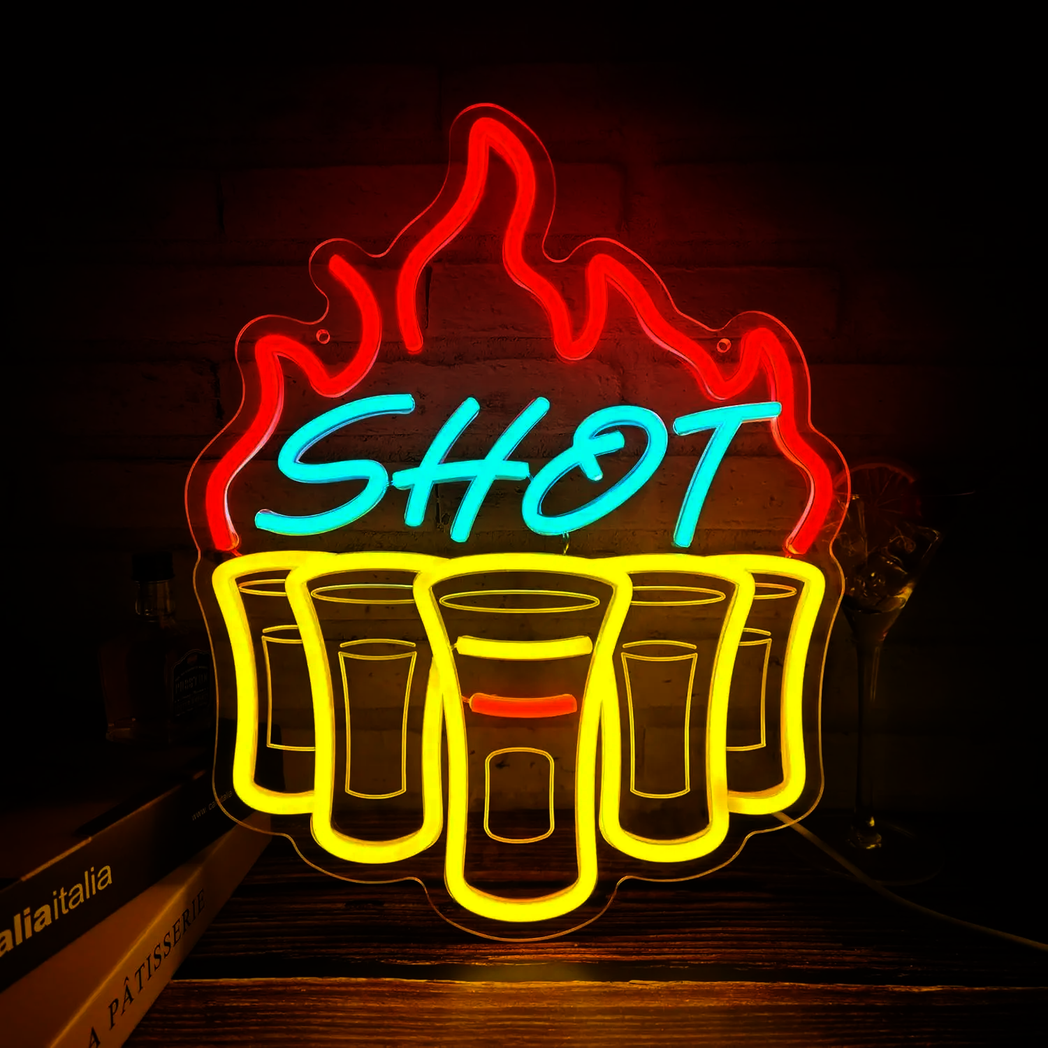 Le Néon Shot représente une série de verres à shot jaunes brillants surmontés d’une flamme rouge éclatante, avec le mot “SHOT” inscrit en turquoise vif au centre.