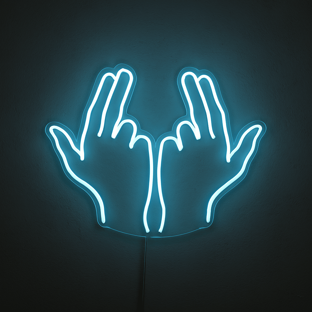 Le Néon Signe Jul représente deux mains ouvertes avec les doigts écartés, réalisées en tube lumineux bleu néon.