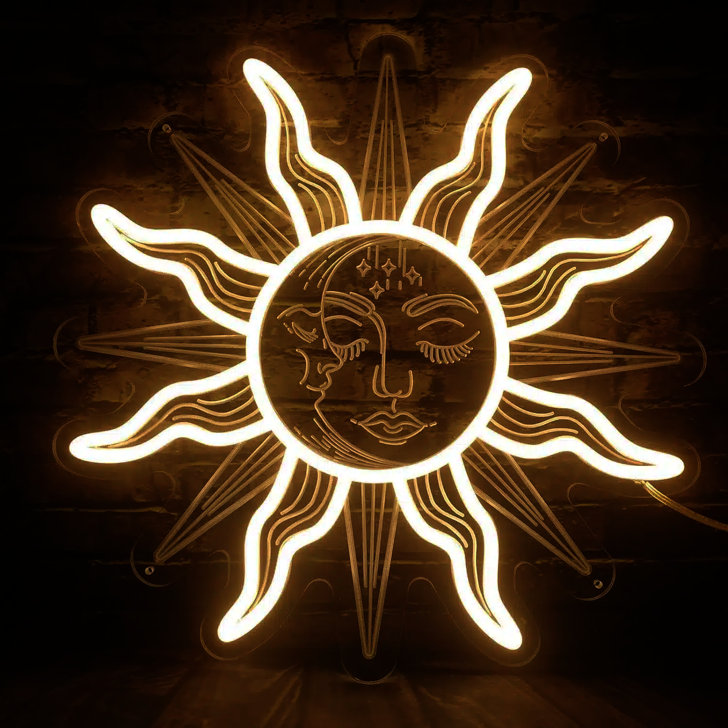 Le Néon Soleil et Lune représente un astre céleste lumineux et souriant, fusionnant harmonieusement le jour et la nuit.
