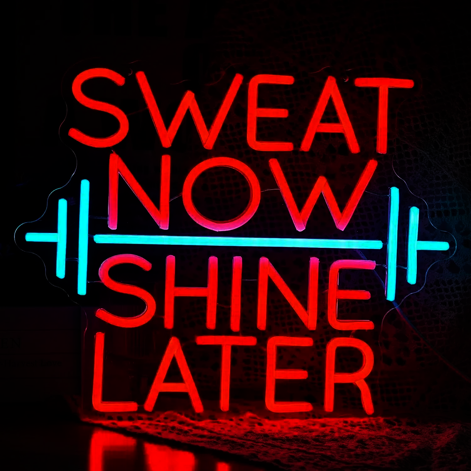 Transpirez maintenant, brillez plus tard avec ce néon motivationnel aux lettres majuscules sur quatre lignes, orné d’haltères stylisés bleus, parfait pour booster vos séances d’entraînement.