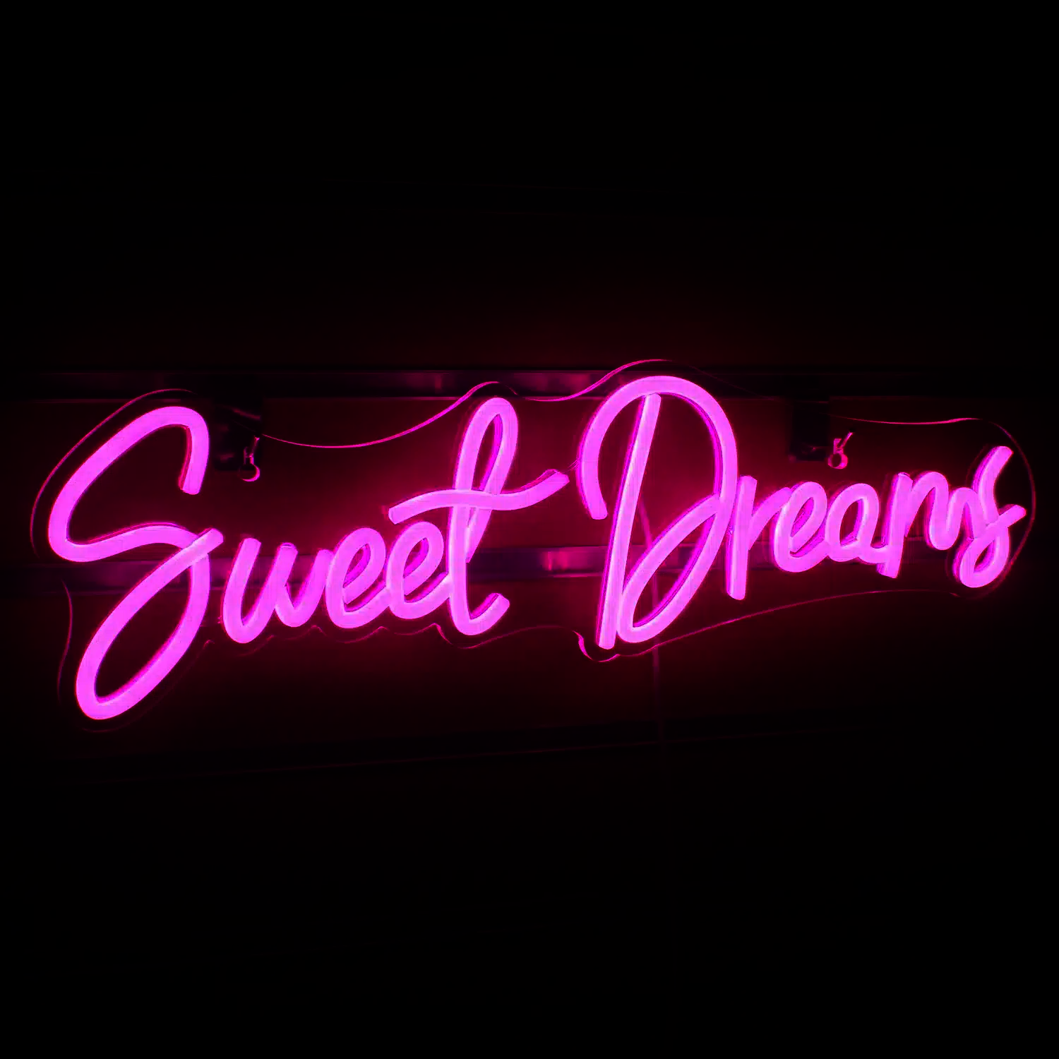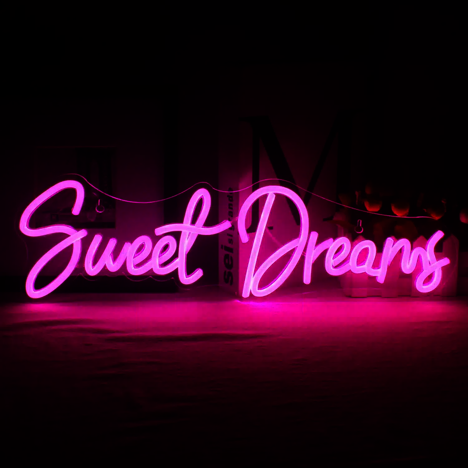 Le Néon Sweet Dreams affiche ces mots en élégante écriture cursive, illuminés d’une douce lueur rose.