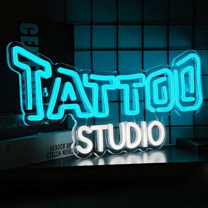 Exprimez votre passion pour l’art corporel avec le Néon Tattoo Studio. Ses lettres bleues turquoise et blanches créent un contraste saisissant, “TATTOO” en caractères épais dominant “STUDIO” plus élancé.