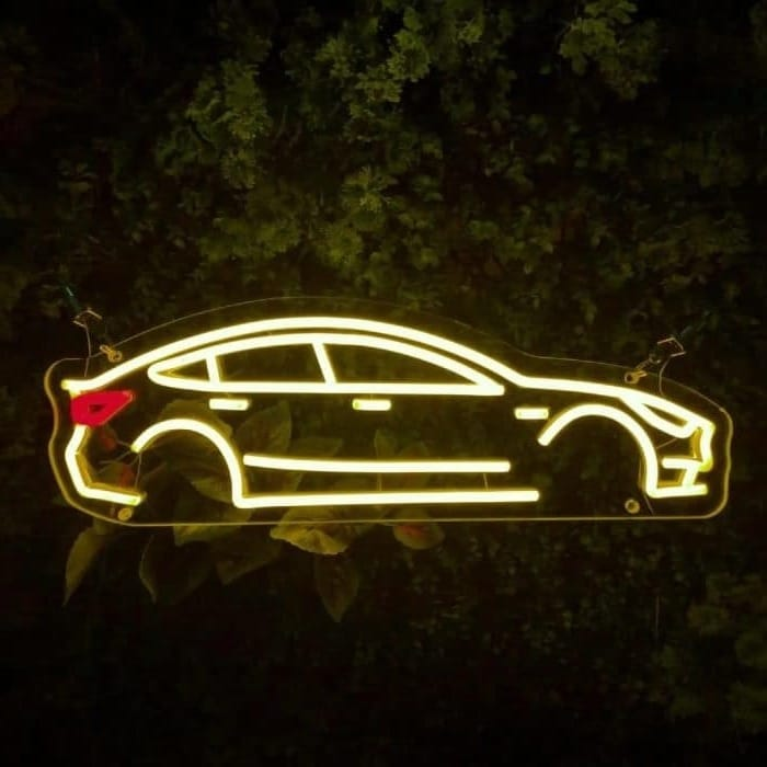 Ce néon illustre la Tesla Model 3 en jaune ou en rouge, selon votre choix, avec des phares arrière rouges distinctifs.