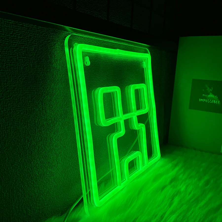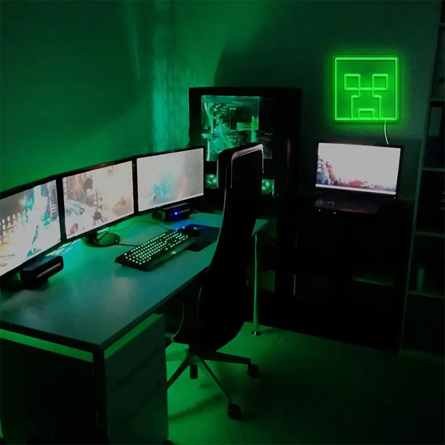 Ce néon affiche la tête carrée et pixelisée du Creeper dans sa forme la plus reconnaissable. Le design est intégralement illuminé d’un vert néon intense et électrique, reproduisant fidèlement la couleur et l’allure pixelisée de la créature qui a fait la réputation du jeu. Les yeux et la bouche sont formés par des lignes de néon vert, soulignant l’expression menaçante et furtive de l’ennemi.