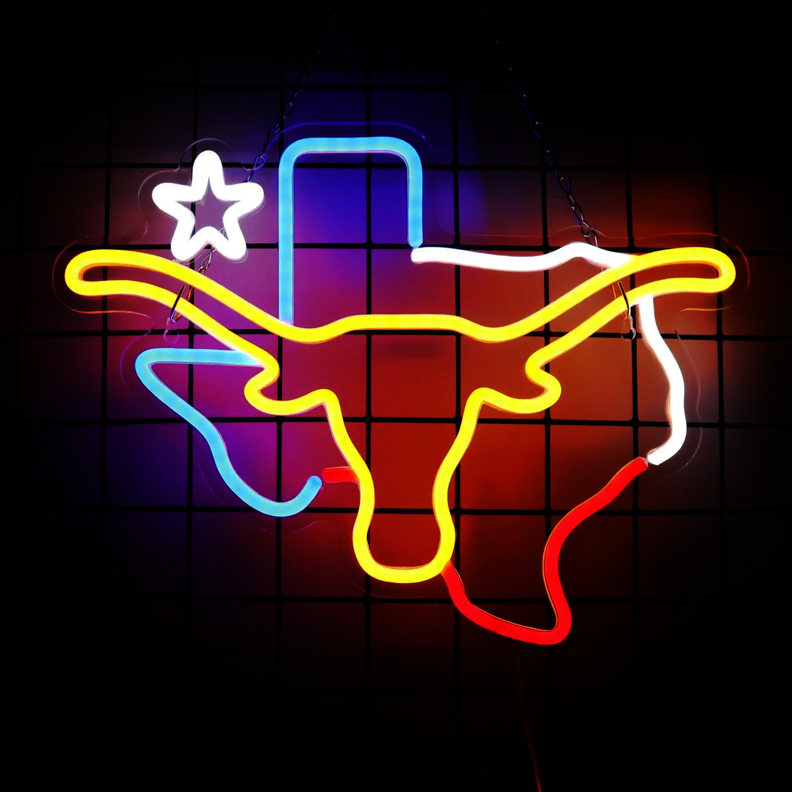 Une étoile lumineuse blanche, rappelant le surnom du Texas “l’État de l’Étoile Solitaire”, est stratégiquement placée dans la partie supérieure gauche du néon, accentuant son authenticité.