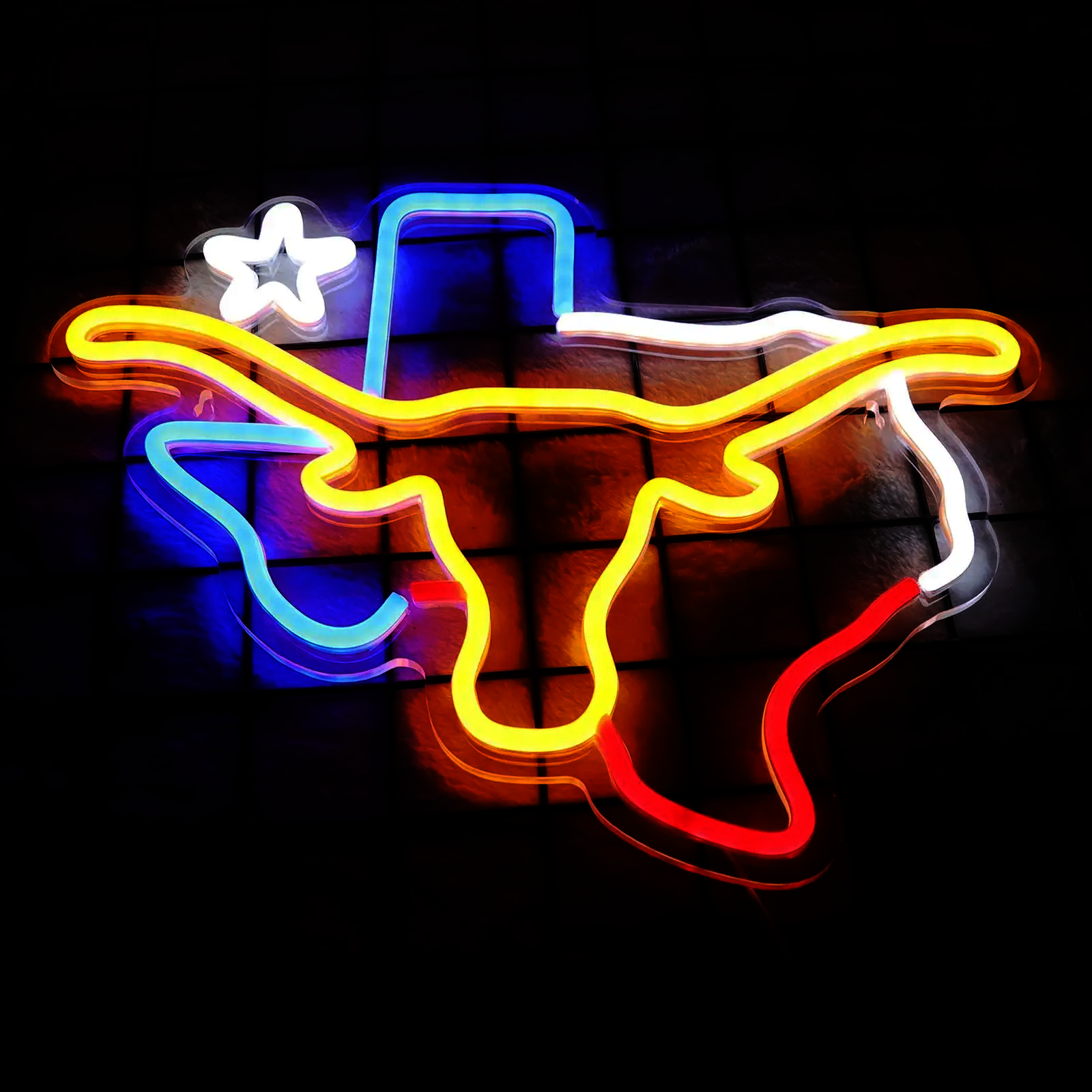 Le Néon Texas représente la silhouette emblématique de l’État du Texas aux États-Unis, réalisée en tubes lumineux colorés.