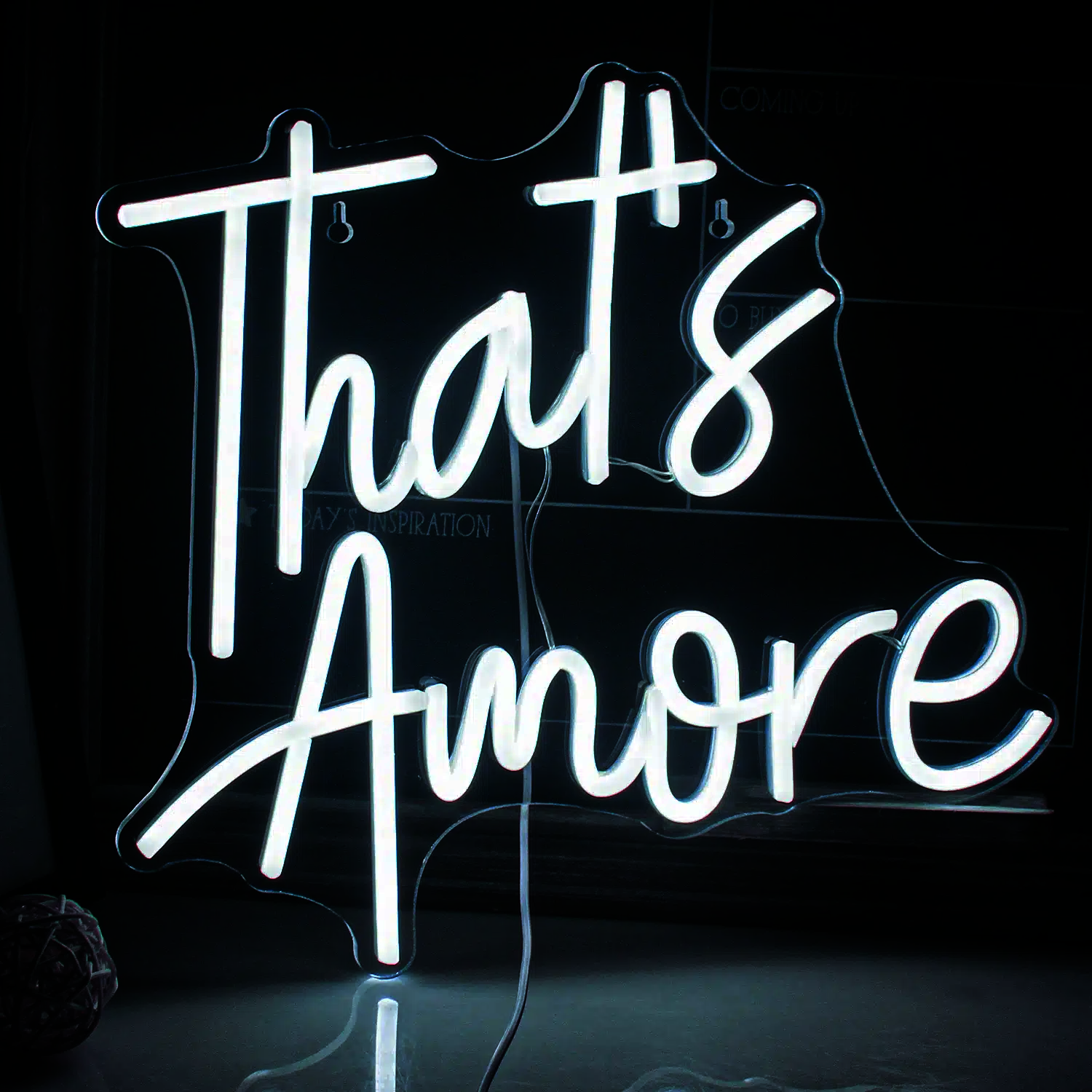 Le Néon That’s Amore affiche une inscription élégante en lettres cursives blanches et lumineuses.