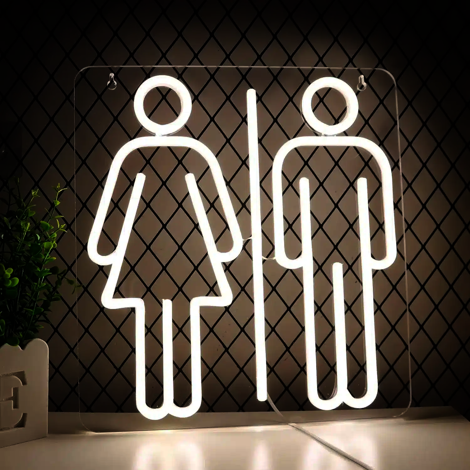Le Néon Toilettes Homme Femme représente les symboles universels pour les toilettes masculines et féminines en lumière blanche éclatante.