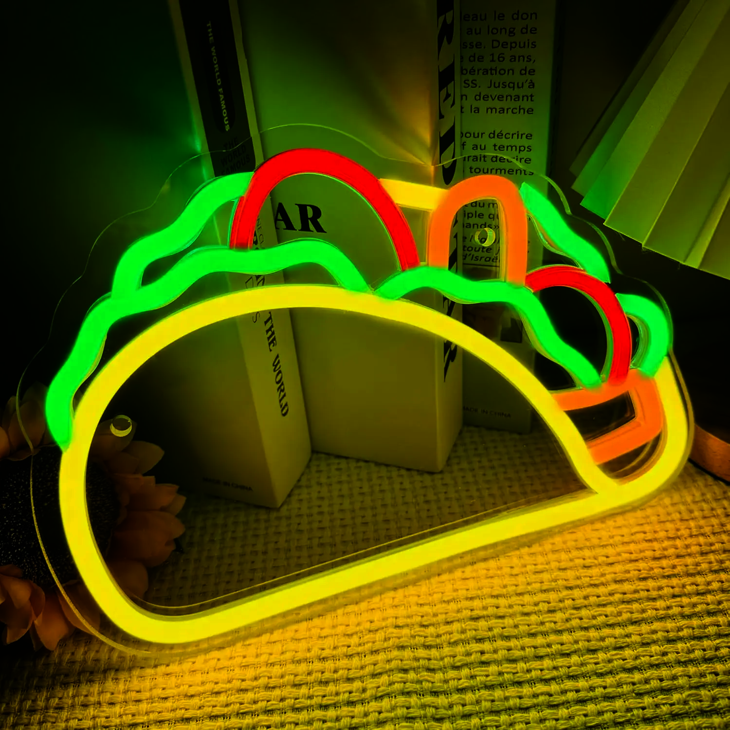 Le Néon Tortilla Mexicaine représente un taco coloré et stylisé, évoquant la cuisine mexicaine traditionnelle.
