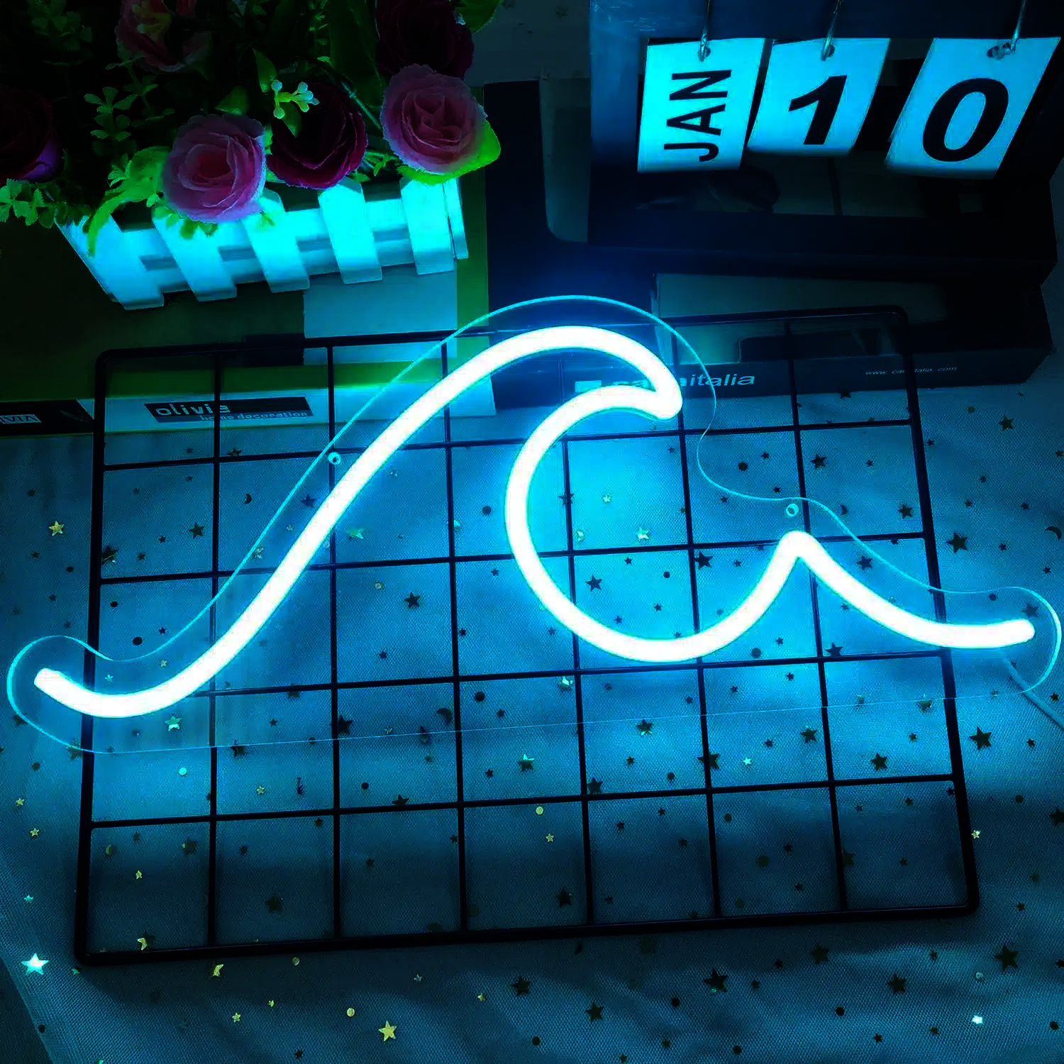 La lumière bleu clair émise par le Néon Vague rappelle la couleur cristalline des eaux tropicales, créant une ambiance apaisante et rafraîchissante.