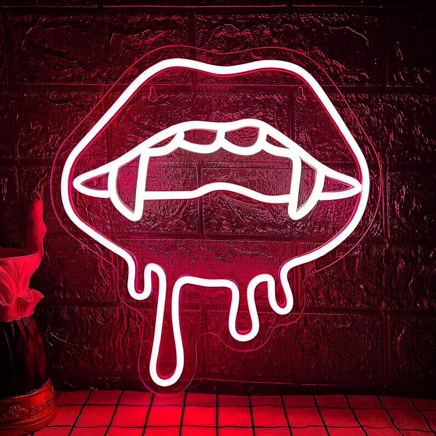Le Néon Vampire représente une bouche féminine aux allures sanguinaires, capturant l’essence même des créatures de la nuit.