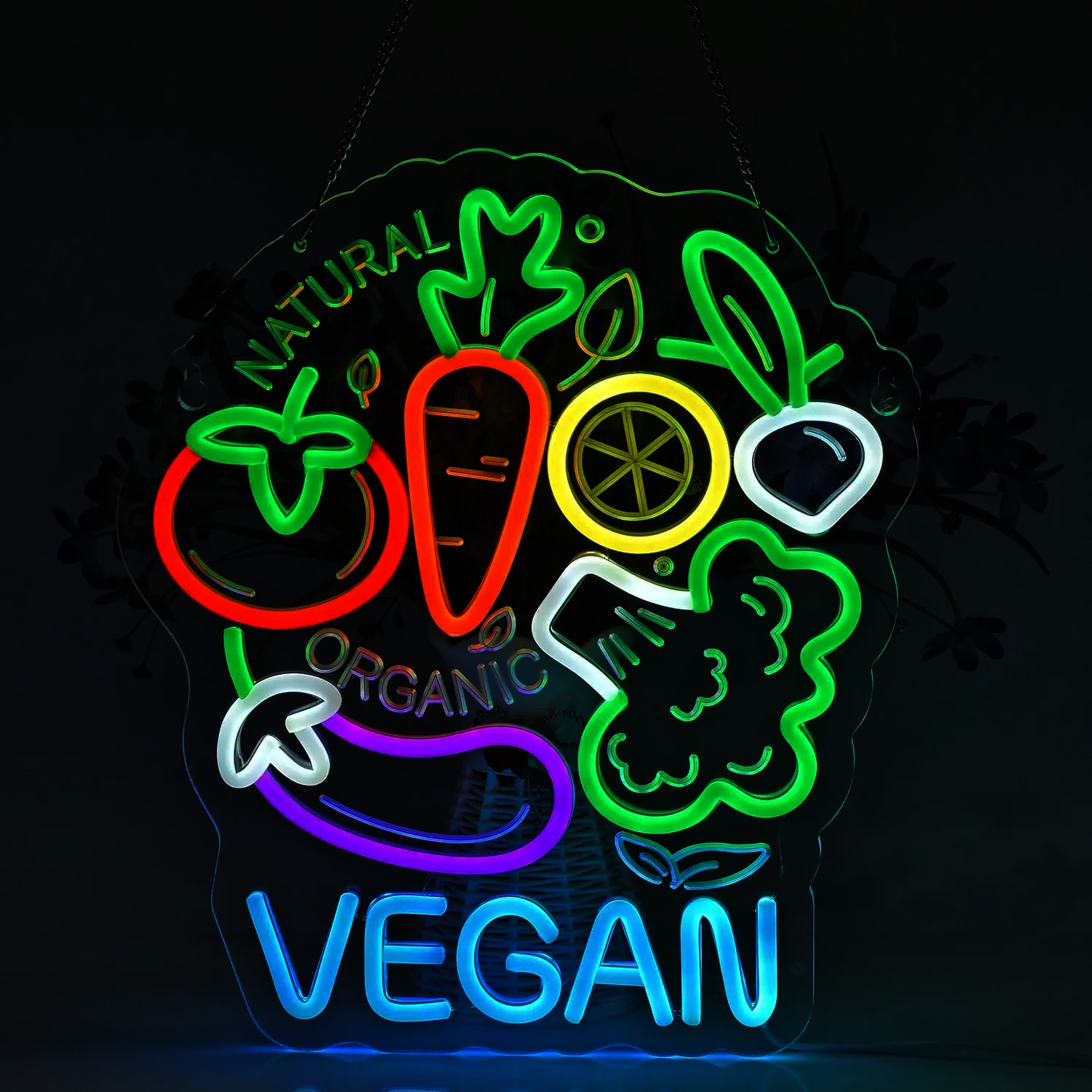 Ce néon met en scène plusieurs légumes et fruits stylisés : une carotte orange avec ses fanes vertes, une aubergine violette aux courbes élégantes, des brocolis verts aux formes arrondies, une tomate rouge avec sa tige, et une tranche de citron jaune reconnaissable à ses quartiers.