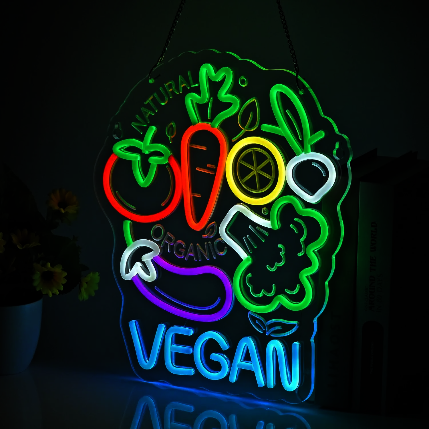 Le Néon Vegan représente une composition colorée d’aliments végétaux disposés autour du mot “VEGAN” en lettres bleues lumineuses.
