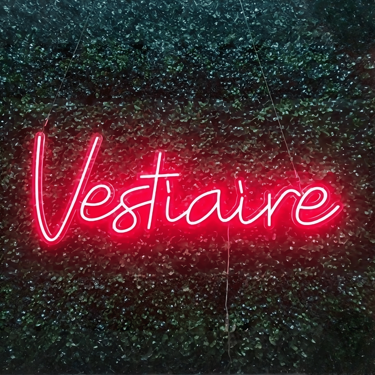 Le Néon Vestiaire affiche le mot “Vestiaire” en élégantes lettres cursives rouges lumineuses.