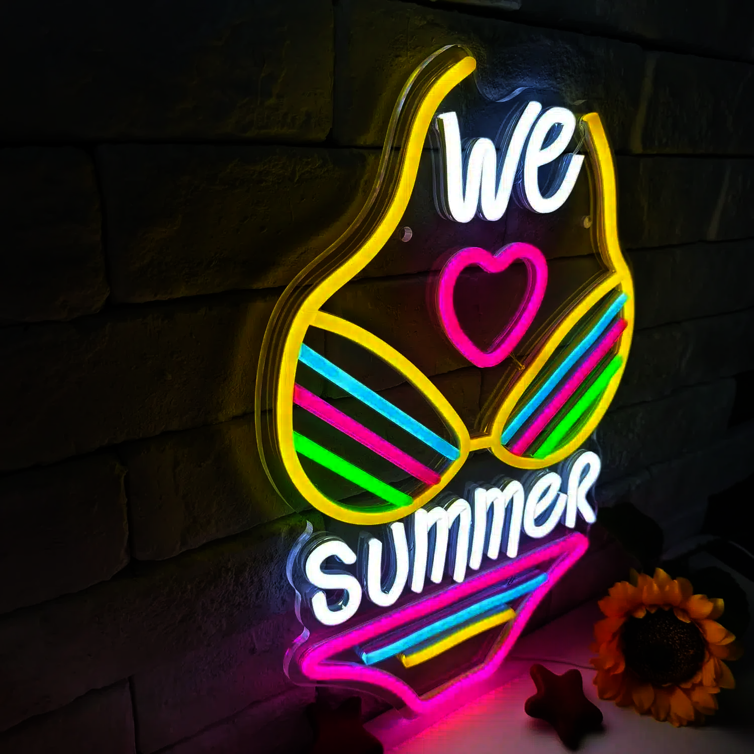 Le Néon We Love Summer affiche le texte “We ❤ Summer” (“We love summer”, ou “Nous aimons l’été”) en lettres blanches, intégré dans le design d’un maillot de bain deux pièces.