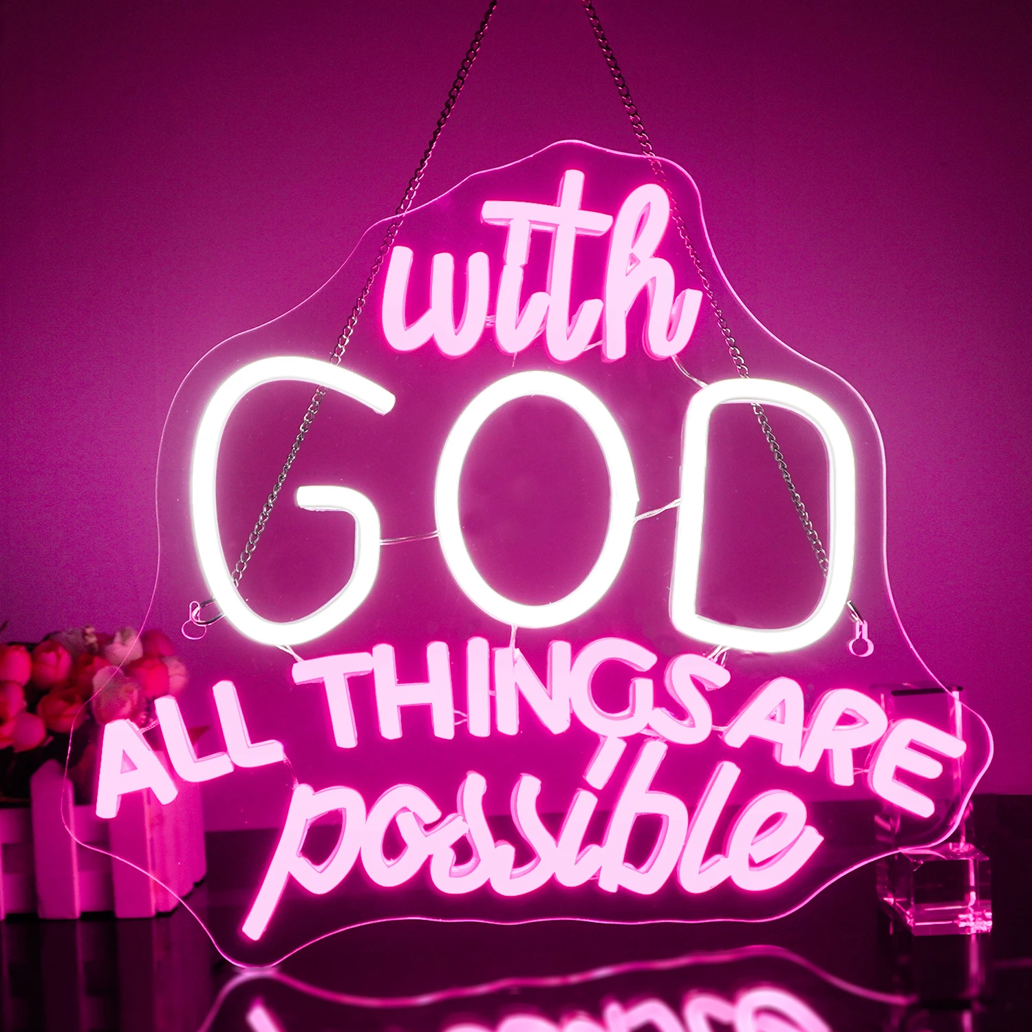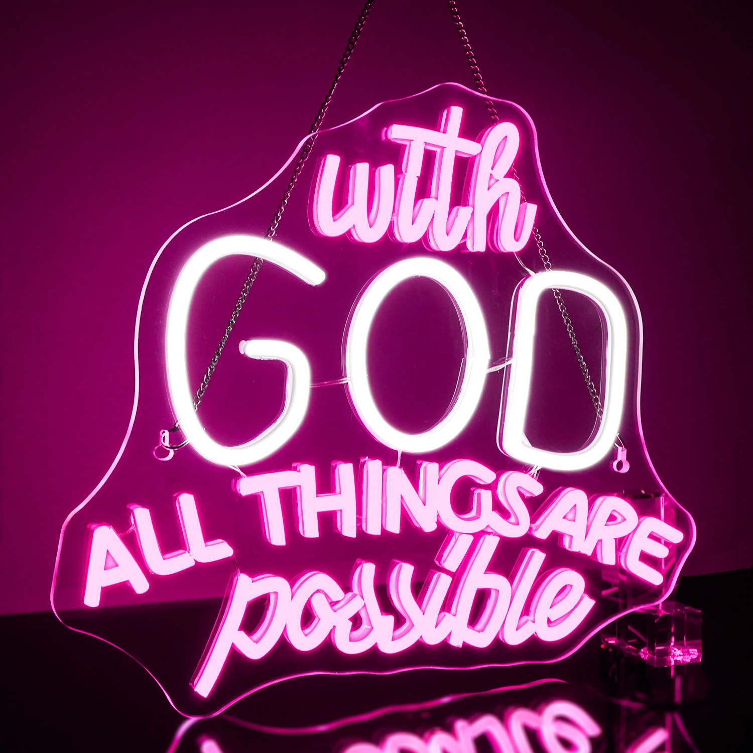 Ce néon affiche la phrase complète « with GOD ALL THINGS ARE possible » avec une typographie mélangeant l’écriture manuscrite et des lettres capitales affirmées. Le mot « GOD » est mis en évidence par une lumière blanche éclatante, tandis que le reste du message brille d’un rose magenta doux et enveloppant.