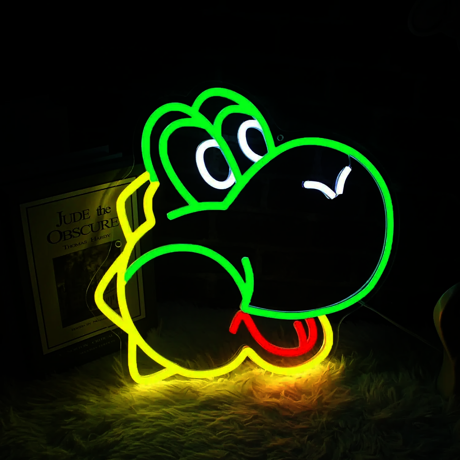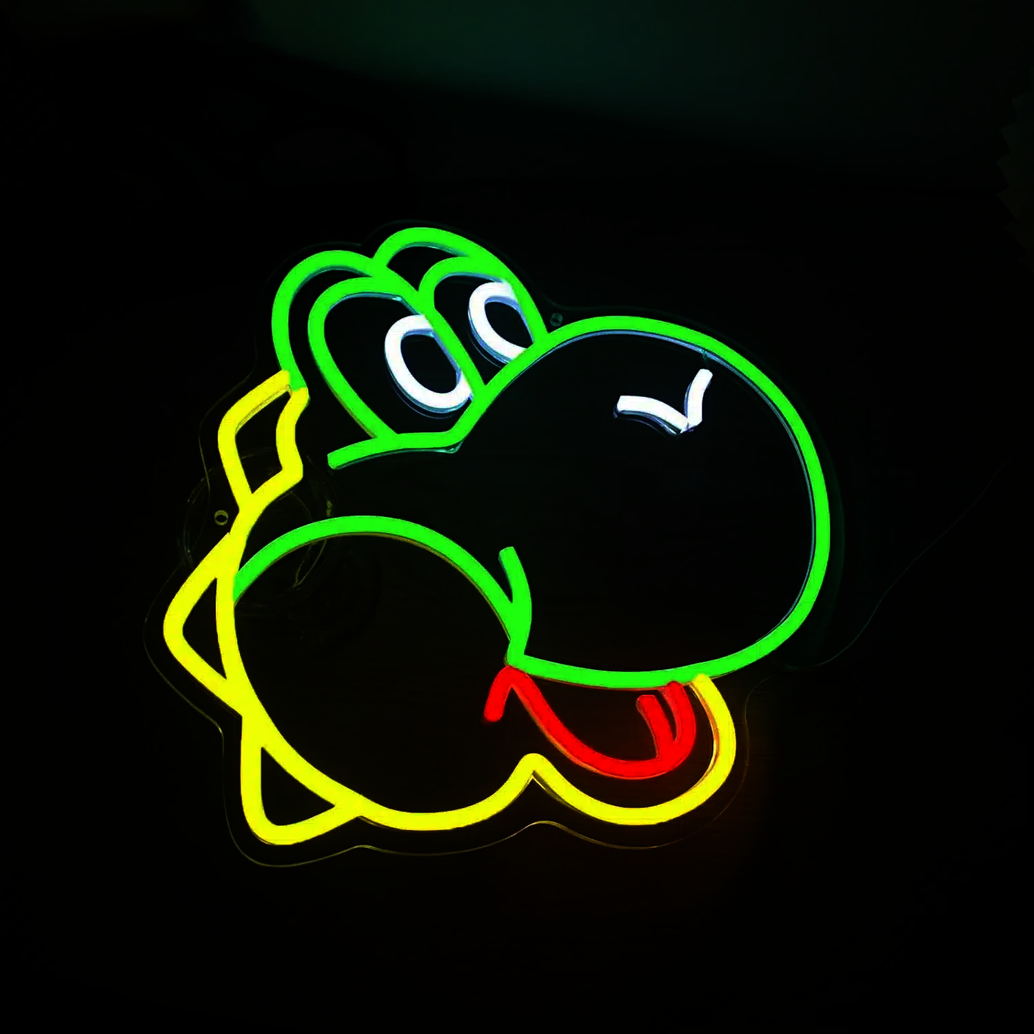 Le Néon Yoshi Mario Bros représente le personnage emblématique de Yoshi, le fidèle compagnon dinosaure de la série de jeux vidéo Super Mario.