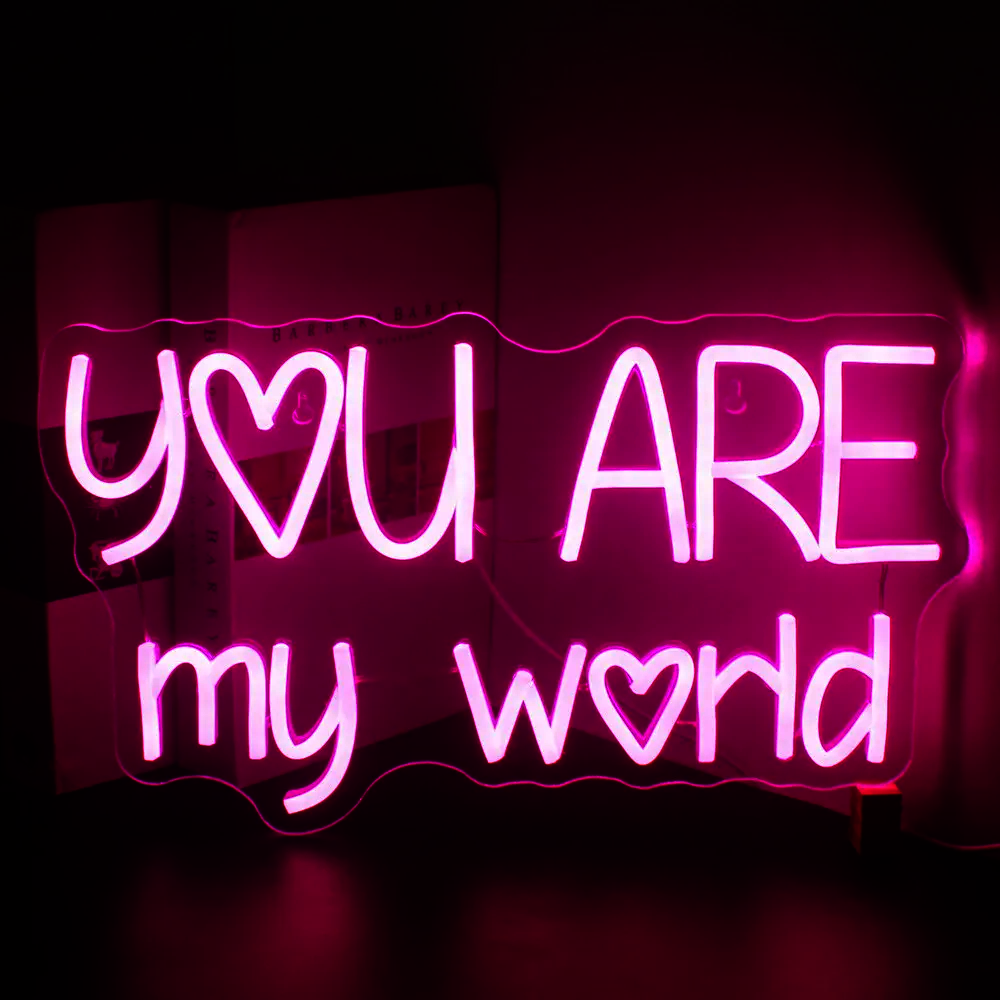 Ce Néon You are my world est idéal pour une chambre à coucher, un salon ou même un espace de réception de mariage.