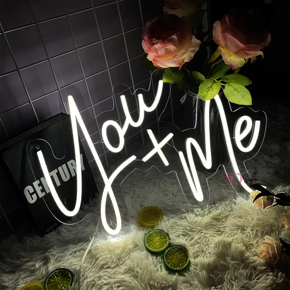 Ce néon affiche les mots “You + Me” (Toi + Moi) en lettres blanches lumineuses, créant une ambiance intime et chaleureuse.